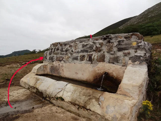 Esta braña dispone de una buena fuente, aquí dejamos el PR para seguir por un camino poco marcado entre piornos al principio, mas adelante hay que tomar como referencia el pequeño collado donde acaba la línea roja, desde él, por un camino evidente ganamos la collada de la Muesca