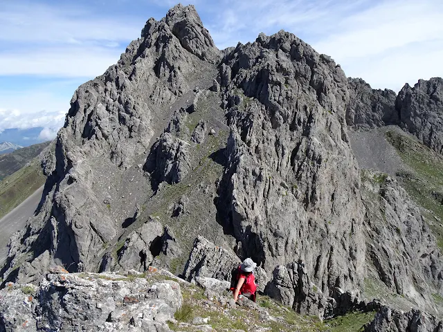 Una vez en la vertiente O. este es el itinerario a seguir, (está jitado) es el paso más complejo de la ruta II+ o -III. La trepada hasta el filo de la arista es fácil, pero con bastante ambiente.